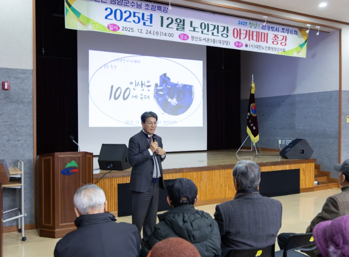 | ▲ ‘노인건강아카데미 종강식’에서 김돈곤 청양군수가 ‘인생을 100세부터’라는 주제로 특강을 진행하고 있다. |