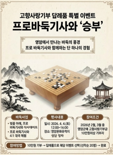 올해 2~3월 영암군에 10만원 이상 고향사랑기부하는 기부자 중 답례품 특별이벤트 ‘프로바둑기사와 승부’를 선택한 선착순 20명에게 ‘마한의 심장 영암’ 바둑팀 프로기사들과 대국을 나눌 기회를 제공한다.