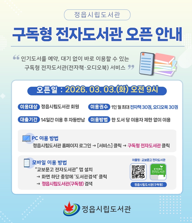 이용 방법은 정읍시립도서관 누리집(홈페이지)에 접속해 로그인한 뒤, 상단 전자도서관 페이지 메뉴에서 ‘구독형 전자책’을 누르면 피시(PC)나 스마트폰, 태블릿 등 기기에 구애받지 않고 손쉽게 책을 대출해 읽을 수 있다.