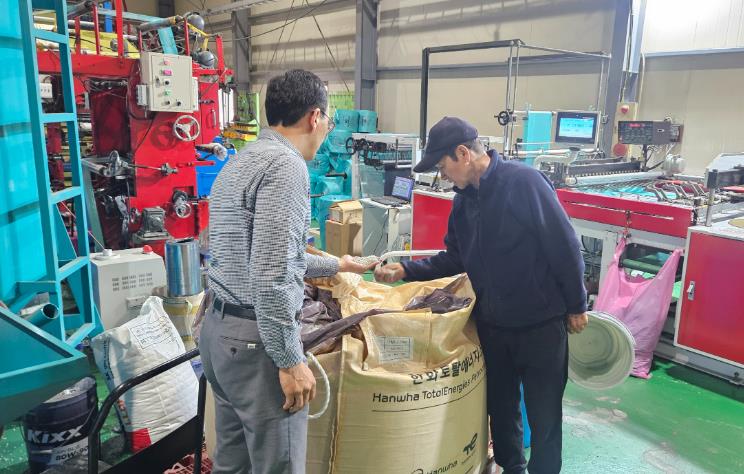 | ▲ 영주시 종량제봉투 생산업체를 방문해 조기 공급을 요청하고 원료 점검을 실시하고 있다 |