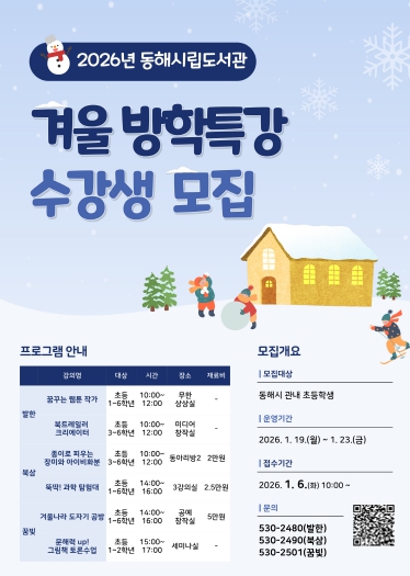 접수는 1월 6일 오전 10시부터 동해시립도서관 홈페이지를 통해 선착순으로 진행되며, 신청은 홈페이지 내 독서문화 → 프로그램 신청 메뉴를 통해 가능하다.