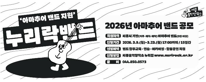 [뉴스앤톡] 세종시문화관광재단은 오는 3월 23일까지 ‘2026년 누리락밴드’ 사업에 참여할 지역 아마추어 밴드를 모집한다.