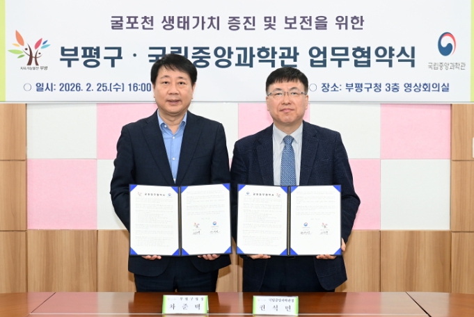 [뉴스앤톡] 부평구는 25일 오후 4시 구청 영상회의실에서 국립중앙과학관과 ‘굴포천 생태가치 증진 및 보전을 위한 업무협약’을 체결했다.