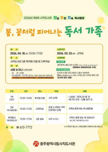 [뉴스앤톡] 광주광역시 시립도서관은 사직도서관에서 가족이 함께 책을 읽고 지식을 나누는 ‘제8회 단무지(단순·무한·지속) 독서캠프’를 오는 4월18일 개최키로 하고, 캠프에 참가할 초등생 가족을 23일부터 선착순 모집하고 있다.