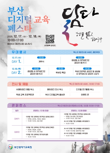 ‘부산 디지털 교육 콘퍼런스’와‘디지털 연구활동’ 부스에서는 디지털 기반 교육혁신 연구학교와 교사 연구회, 디지털 선도교사들이 AI·디지털 교육자료 활용 수업 모델, 에듀테크 활용 특수교육 및 체육수업 등 현장에 바로 적용 가능한 생생한 수업 혁신 사례를 공유할 예정이다.