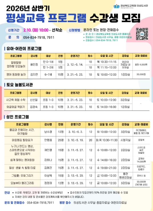 [뉴스앤톡] 경상북도교육청 의성도서관은 지역주민의 평생학습 기회를 확대하고 삶의 질 향상을 도모하기 위해 2월 10일(화)부터 상반기 평생교육 프로그램 수강생을 모집한다고 밝혔다.