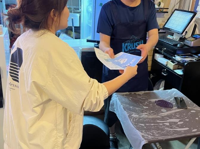 ▲ 구 직원이 영업자 준수사항 홍보물을 배부하고 있다.
