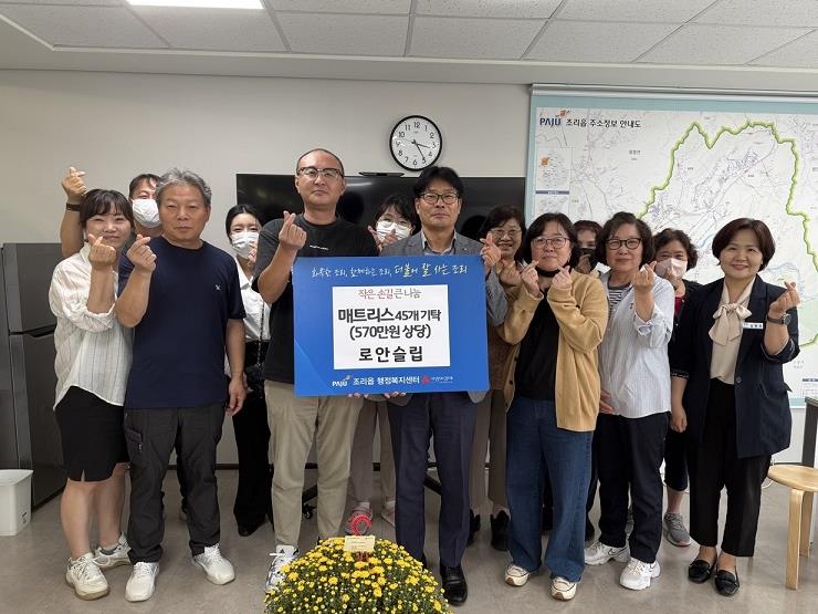 [뉴스앤톡] 파주시 조리읍은 지난 23일, 관내 가구업체 ’로안슬립‘으로부터 추석을 맞아 관내 취약계층을 위한 매트리스 45개(약 570만 원 상당)를 기탁 받았다고 밝혔다.