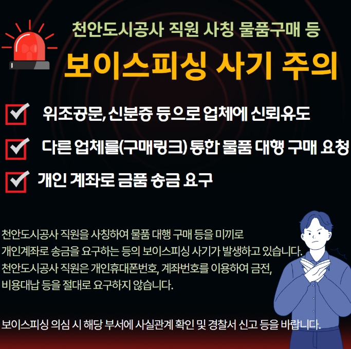 [뉴스앤톡] 천안도시공사가 최근 공사 직원을 사칭한 보이스피싱 사례가 발생함에 따라 피해 예방을 위한 주의를 당부했다.