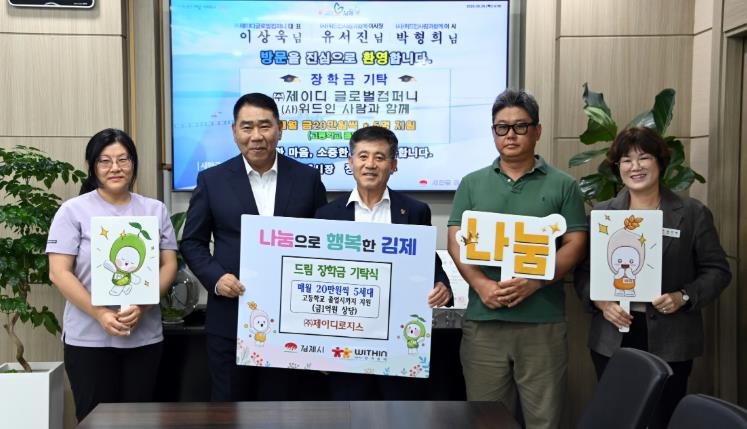 [뉴스앤톡] 김제시는 ㈜제이디로지스와 (사)위드인사람과함께가 취약계층 아동·청소년을 위한 후원협약과 드림장학금 전달식을 가졌다고 밝혔다.