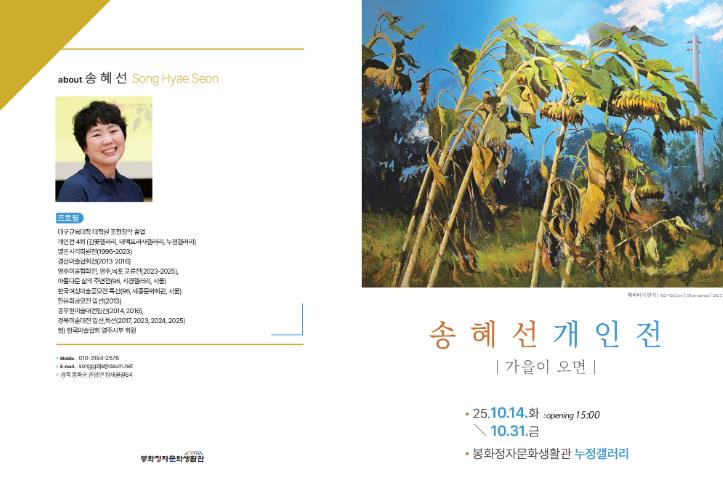 [뉴스앤톡] 봉화정자문화생화관은 10월 14일부터 31일까지 누정갤러리에서 송혜선 작가의 개인전 '가을이 오면'을 개최한다.