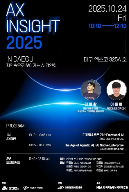 [뉴스앤톡] 대구광역시는 (사)과실연 AI미래포럼과 함께 10월 24일(금) 대구 엑스코에서 ‘AX·Security Insight 2025 In Daegu’를 개최한다.