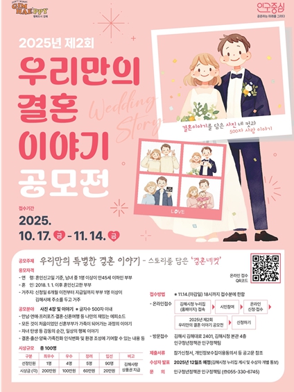 [뉴스앤톡] 김해시는 시민 참여와 공감을 기반으로 결혼의 긍정적 의미를 확산하고 가족의 가치를 널리 알리기 위해‘제2회 우리만의 결혼 이야기 공모전’을 개최한다고 21일 밝혔다.