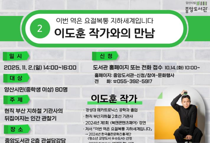 [뉴스앤톡] 양산시립 중앙도서관은 11월 2일 이도훈 작가를 초청해 작가와의 만남 행사를 개최한다.