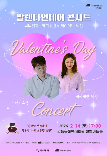 [뉴스앤톡] 구미시는 오는 2월 14일 오후 5시, 강동문화복지회관 천생아트홀에서 발렌타인데이 콘서트〈부부천재 : 커피소년 x 제이레빗 혜선〉을 개최한다.