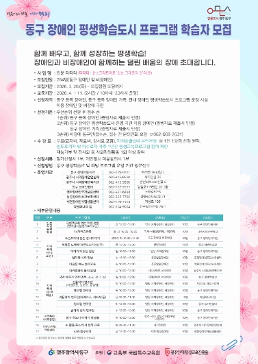 [뉴스앤톡] 광주 동구는 교육부 국립특수교육원이 주관하는 ‘2026년 장애인 평생학습도시 운영 사업’ 특성화 부문에 선정돼 장애인을 위한 맞춤형 평생학습 프로그램을 본격적으로 추진한다고 밝혔다.