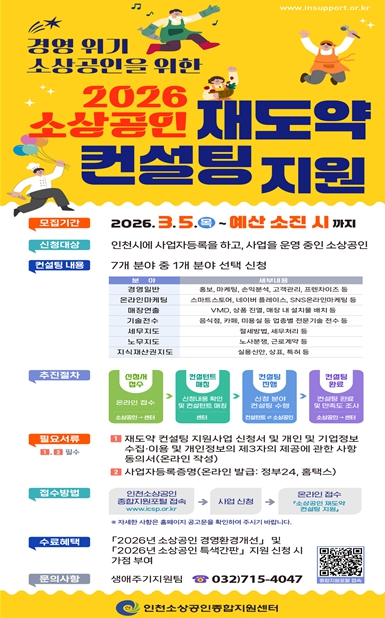 [뉴스앤톡] 인천광역시는 오는 3월 5일부터 인천지역 소상공인을 대상으로 경영위기 극복 및 영업 활성화를 위한 소상공인 재도약 컨설팅 지원사업을 본격 추진한다고 밝혔다.