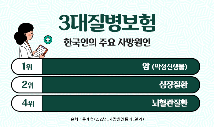 [뉴스앤톡] 한국인의 주요 사망원인중에 암, 뇌혈관질환, 심혈관질환은 흔히 3대질병이라 일컬어지며 살아가면서 가장 먼저 대비해야 하는 중대질병으로 항상 강조되고 있다. 이들 질병에 미리 대비하기 위해 가입하는 것이 진단비보험인데, 이러한 3대질병진단비를 중점으로 보장하는 보장성보험이 3대진단비보험 이다. 3대질병진단비보험은 각각의 질병에 주목해서 보장하기도 하지만, 나에게 맞는 추가 특약을 잘 골라서 가입한다면 종합건강보험으로도 충분히 활용도가 높다.
