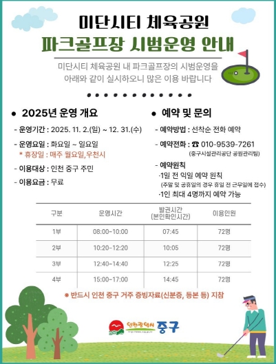 김정헌 중구청장은 “이번 파크골프장 운영으로 구민들의 여가 활동과 건강 증진에 이바지할 수 있을 것”이라며 “시범운영 기간에 다양한 의견을 적극 수렴해 더욱 안전하고 쾌적한 시설이 되도록 최선을 다하겠다”라고 말했다.