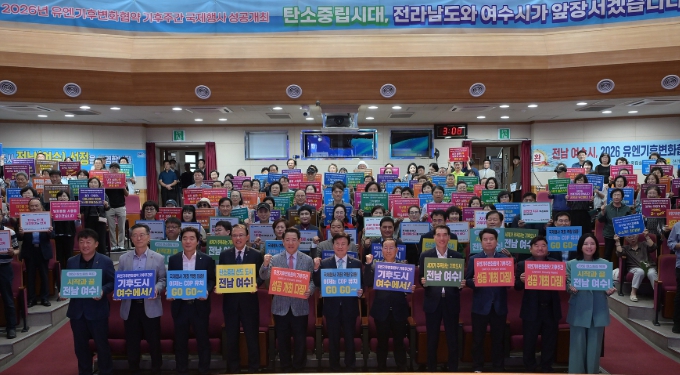 [뉴스앤톡] 여수시는 지난 14일 진남문예회관에서 ‘2026년 유엔기후변화협약(UNFCCC) 기후주간(Climate Week)’ 국내 개최 후보지 선정을 기념하는 행사를 열고 유치를 위한 의지를 다졌다.