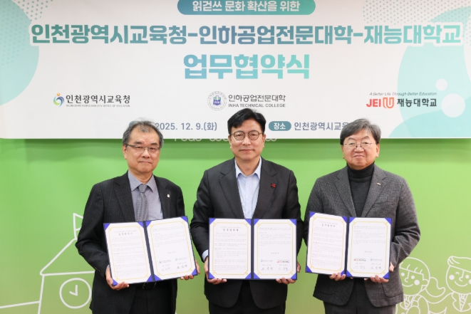 [뉴스앤톡] 인천광역시교육청은 9일 인하공업전문대학, 재능대학교와 읽걷쓰 문화 확산을 위한 업무 협약을 체결했다.