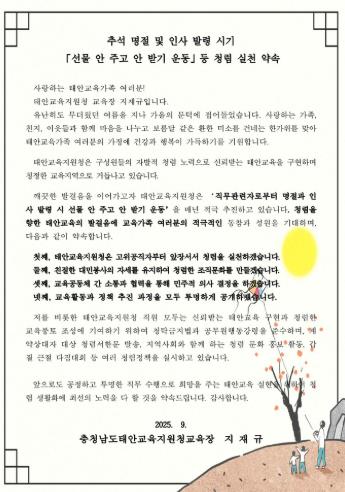 [뉴스앤톡] 충청남도태안교육지원청은 추석 연휴 시기를 맞아 청렴한 공직문화를 확산하기 위해 ‘선물 안 주고 안 받기 운동’을 강조하는 청렴 서한문을 홈페이지에 게시했다.