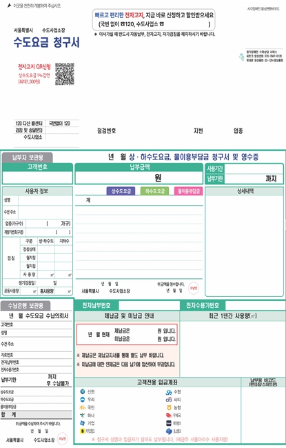 납부 방식 안내도 새롭게 바뀐다. 시는 기존 OCR(광학 문자인식) 밴드 활용 방식을 전자 납부 방식으로 전면 전환해 시민 편의를 높인다.청구서 하단에 인쇄되는 OCR밴드는 요금 납부시 기계가 정보를 자동으로 인식할 수 있는 장치다. 하지만 이용률이 3.7%에 불과하고 공간도 많이 차지하는 단점이 있었다. 전자납부로 방식을 변경하면 이중납부 오류를 줄일 수 있는 장점이 있다.