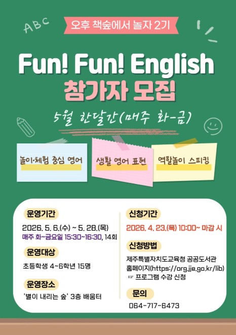 [뉴스앤톡] 제주도교육청 제주도서관은 방과 후 어린이를 대상으로 ‘2026년 오후 책숲에서 놀자’ 2기 펀! 펀! 잉글리쉬(Fun! Fun! English) 참가자를 모집한다.