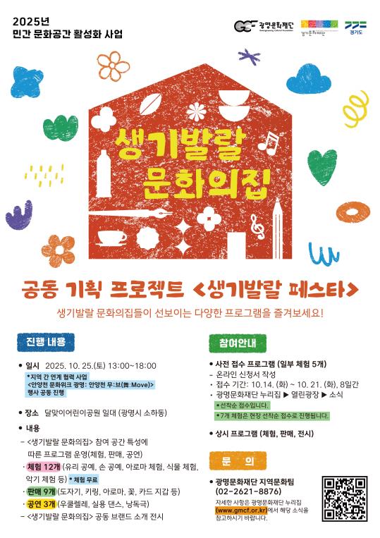 [뉴스앤톡] (재)광명문화재단은 2025년 민간 문화공간 활성화 사업 '생기발랄 문화의집' 공동 기획 프로젝트 ‘생기발랄 페스타’를 10월 25일 오후 1시에 달맞이어린이공원에서 개최한다.