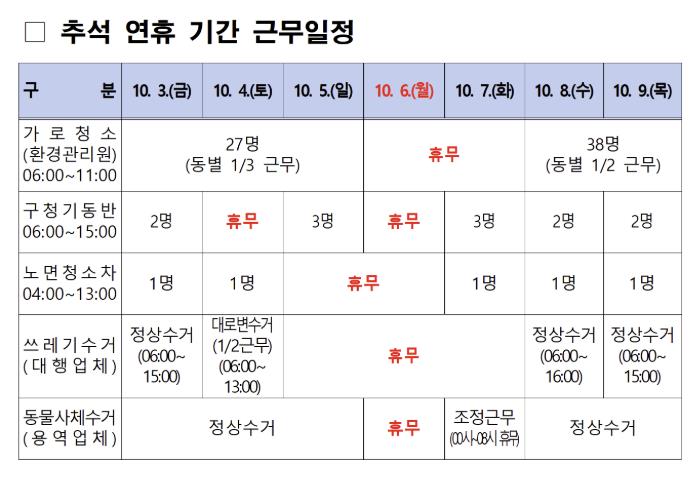 10월 3일부터 9일까지 이어지는 이번 추석 연휴 기간 중 발생되는 적치 쓰레기를 해소하고 청소 관련 민원을 신속하게 처리하기 위하여 동별 청소 인력 배치 및 청소 기동반 운영 등 주민 불편 최소화에 초점을 맞춰 추진된다.
