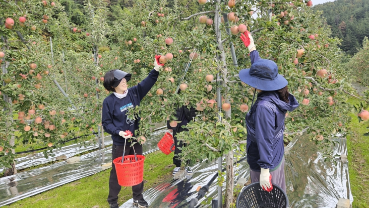이번 봉사활동은 일손이 부족한 농가를 돕기 위해 마련된 자리로, 직원들은 낙과 정리와 수확 작업 등을 함께하며 농민들의 고충을 몸소 체험했다.