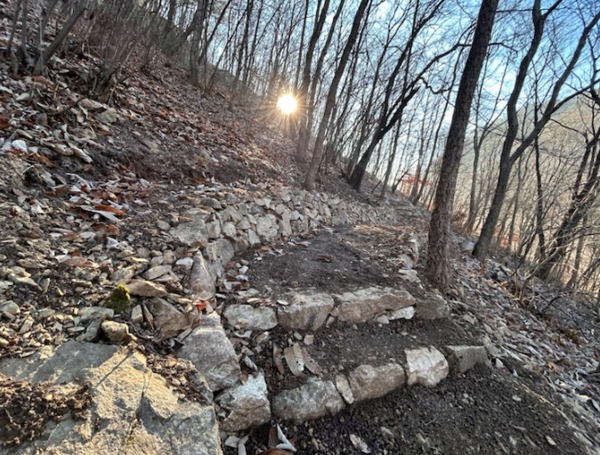이번 사업에 약 2억 원이 투입됐으며 산책로 이용객들의 안전사고 예방과 자연 친화적 산책로 조성을 위해 노면을 고르게 정비하고 방향안내판, 안전로프난간, 돌계단, 돌배수로 등을 설치했다.