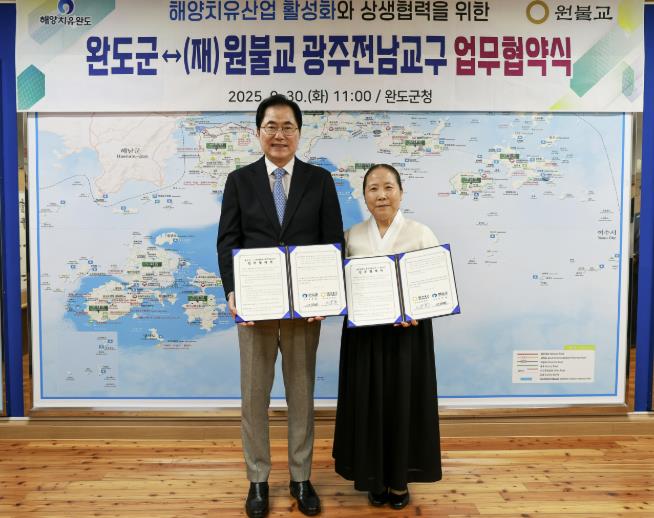 [뉴스앤톡] 완도군이 완도 해양치유산업 활성화를 위해 (재)원불교 광주전남교구와 업무 협약을 체결했다.