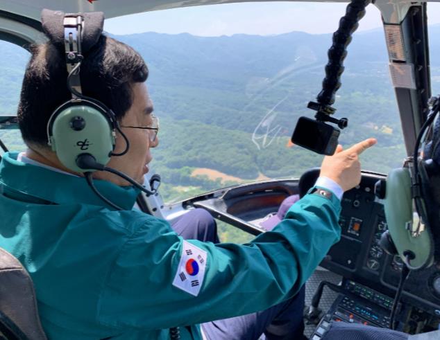 | ▲ 주낙영 경주시장이 지난해 헬기를 타고 토함산 일대 상공에서 산사태 피해 및 위험 지역을 점검하고 있다. |
