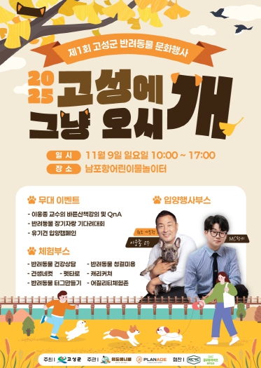 [뉴스앤톡] 고성군은 오는 11월 9일 일요일 오전 10시, 남포항 일원(어린이 물놀이터 입구)에서 제1회 반려동물 문화행사 ‘고성에 그냥 오시개’를 개최한다고 밝혔다.