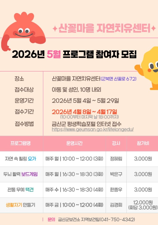 [뉴스앤톡] 금산군은 오는 8일부터 17일까지 산꽃마을 자연치유센터 5월 프로그램 참여자를 모집한다.