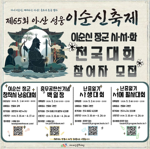 [뉴스앤톡] (재)아산문화재단은 '제65회 아산 성웅 이순신 축제'를 맞아 성웅 이순신 장군의 충효애 정신과 숭고한 뜻을 기리고 계승하기 위한 ‘이순신 장군 시·서·화 전국대회’를 개최하고 전국의 참가자를 모집한다.