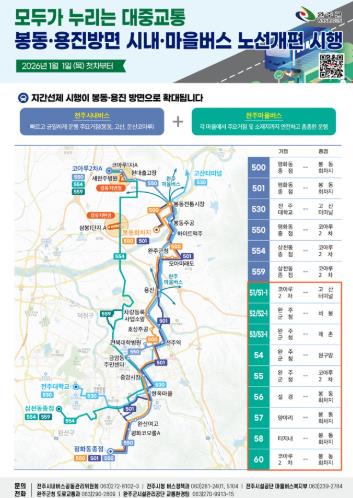 이번 노선 개편으로 전주에서 봉동·용진 방면 각 마을로 운행되던 전주시내버스 21개 노선은 6개 노선으로 통합돼 봉동교 차고지, 둔산코아루아파트, 고산터미널까지 규칙적인 배차간격으로 운행된다.