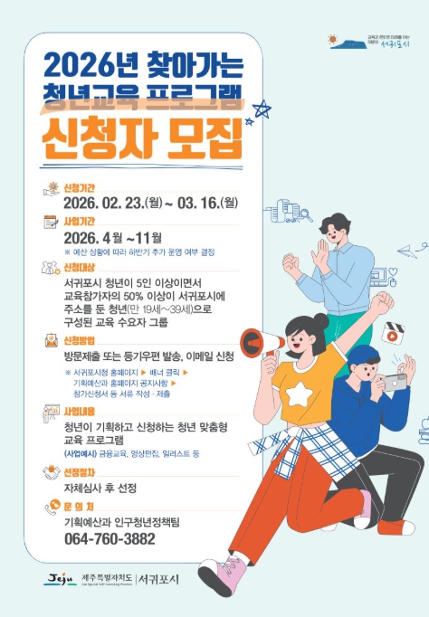 [뉴스앤톡] 서귀포시는 청년의 지속가능한 성장과 자기 계발을 지원하기 위해 23일부터 3월 16일까지 ‘2026년 찾아가는 청년교육’ 프로그램 참여자를 모집한다고 밝혔다.