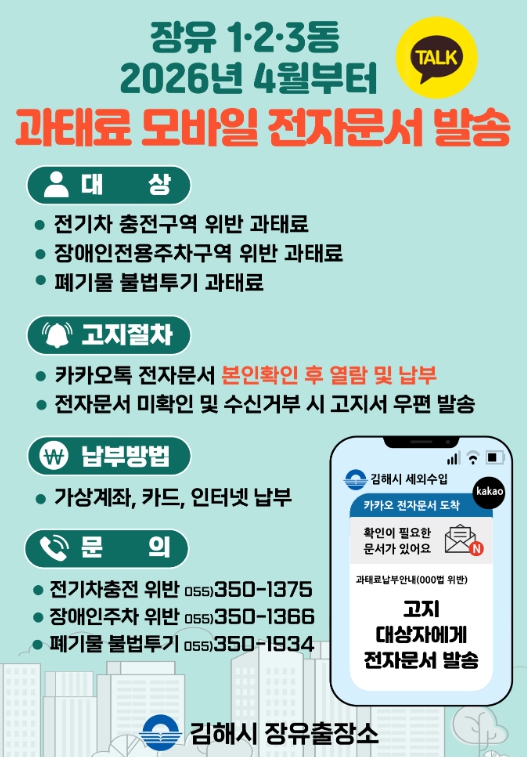 [뉴스앤톡] 김해시 장유출장소는 오는 4월 1일부터 과태료 고지서 모바일 전자문서 발송 서비스를 도입한다고 23일 밝혔다.