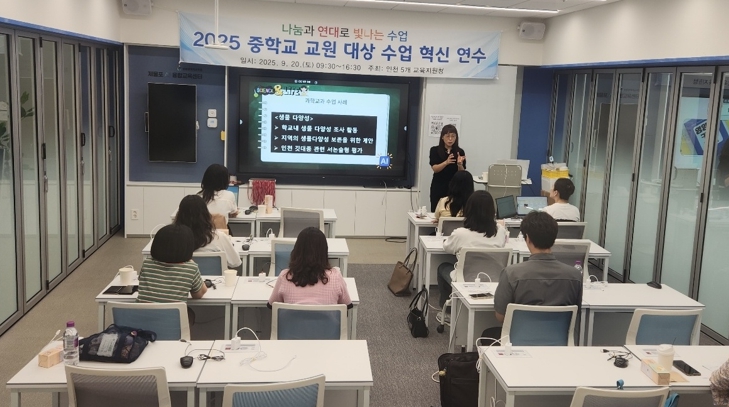 [뉴스앤톡] 인천광역시교육청은 20일 제물포AI융합교육센터에서 관내 5개 교육지원청 주관으로 ‘2025 중학교 교원 대상 수업혁신 연수’를 운영했다고 밝혔다.