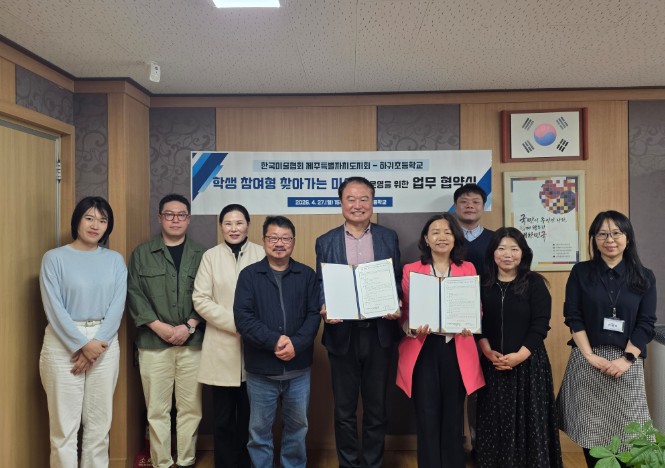 [뉴스앤톡] 제주도교육청 하귀초등학교는 27일 한국미술협회 제주특별자치도지회와 ‘학생 참여형 찾아가는 미술관’ 운영을 위한 업무협약(MOU)을 체결했다.