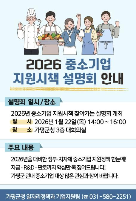 가평군은 관내 중소기업을 대상으로 ‘2026년 중소기업 지원시책 설명회’를 오는 22일 오후 2시 가평군청 3층 대회의실에서 개최한다고 밝혔다. 이번 설명회는 2026년도 중소기업 지원정책을 종합적으로 소개하는 한편 기업 현장의 애로사항을 직접 청취해 정책 수요에 반영하기 위해 마련됐다. 설명회에는 중소벤처기업진흥공단, 기술보증기금, 소상공인진흥공단, 경기중소벤처기업청 등 10개 기관이 참여한다.