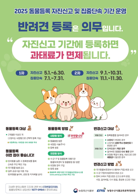군 관계자는 “반려동물 등록은 유실·유기 방지와 소유자의 책임 의식 강화를 위한 법적 의무사항”이라며 “책임있는 반려문화가 자리 잡을 수 있도록 자진신고 기간 내 소유자의 적극적인 참여를 바란다”고 당부했다.