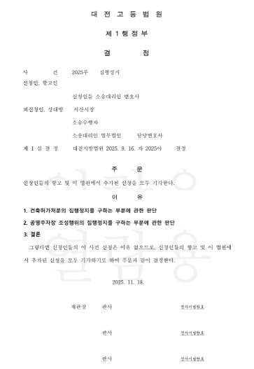 [뉴스앤톡] 충남 서산시가 추진하는 예천지구 공영주차장(초록광장) 조성사업과 관련하여 일부 시민이 제기한 건축허가처분 집행정지 항고에 대해 대전고등법원이 18일 기각 결정을 내렸다.