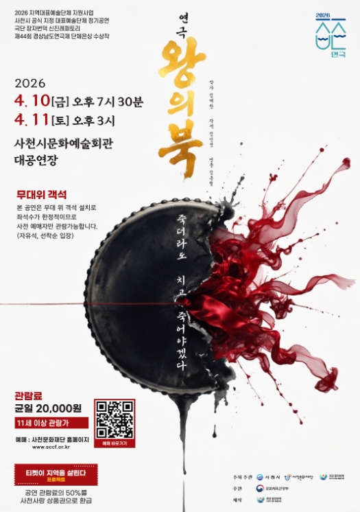 [뉴스앤톡] 사천시와 사천문화재단 그리고 사천시 공식 지정 대표예술단체인 극단 장자번덕이 오는 4월 10일 오후 7시 30분과 11일 오후 3시, 이틀에 걸쳐 사천시문화예술회관 대공연장에서 연극 '왕의 북'을 무대에 올린다.