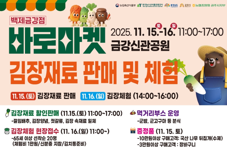 [뉴스앤톡] 공주시는 본격적인 김장철을 맞아 지역 농산물 소비를 촉진하고 시민들에게 체험 기회를 제공하기 위해 ‘바로마켓 김장 재료 판매 및 체험 행사’를 오는 15일과 16일 이틀간 공주 금강신관공원에서 연다고 밝혔다.