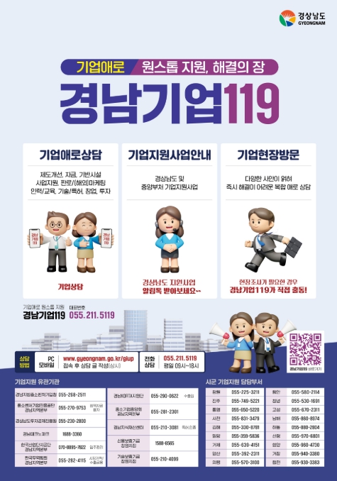 경남기업119는 상담부터 컨설팅, 지원사업 안내, 복합 애로 상담을 위한 기업 현장 방문까지 원스톱으로 지원하는 온라인 기업애로 처리 시스템이다.