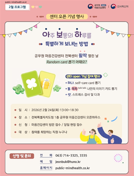 공무원 마음건강센터는 '공무원 재해보상법' 제46·47조 및 시행령 제57조에 근거해 인사혁신처가 민간 심리상담 전문기관(휴노)에 위탁 운영하는 기관이다. 서울(2008년)을 시작으로 전국에 순차 설치돼 온 이 센터는 이번 전북센터 개소로 전국 11번째 거점을 확보하게 됐다. 도청 1층 전 법률상담실을 리모델링해 올해 2월 공사를 완료한 뒤 약 2주간의 준비 기간을 거쳐 문을 열었다.