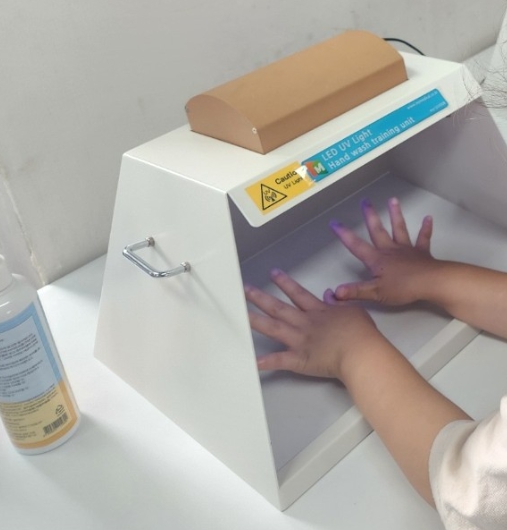 대여 장비인 손세정 검사기(뷰박스)는 형광물질을 활용한 체험형 교육기구다. 손에 형광 로션을 바른 뒤 손을 씻고 검사기에 넣으면 남아 있는 형광물질이 하얗게 표시돼, 자신의 손 씻기 상태를 눈으로 확인하고 바로잡을 수 있다.